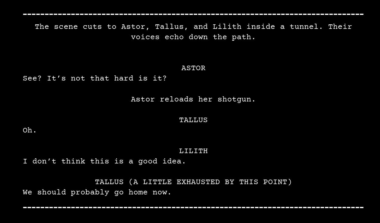 Font size should be 11 with 1.15 spacing, font itself isn’t particularly important as long as it’s readable. I format scripts with stage directions and character names centered. Lines themselves are aligned on the left. Keep in mind this isn’t “the industry standard”, just what I find to be easiest to read and write. Stage directions should be focused on audio details. Visual details are difficult to communicate and should only be included for the sake of the cover art or as direction for VAs. Here is an example.